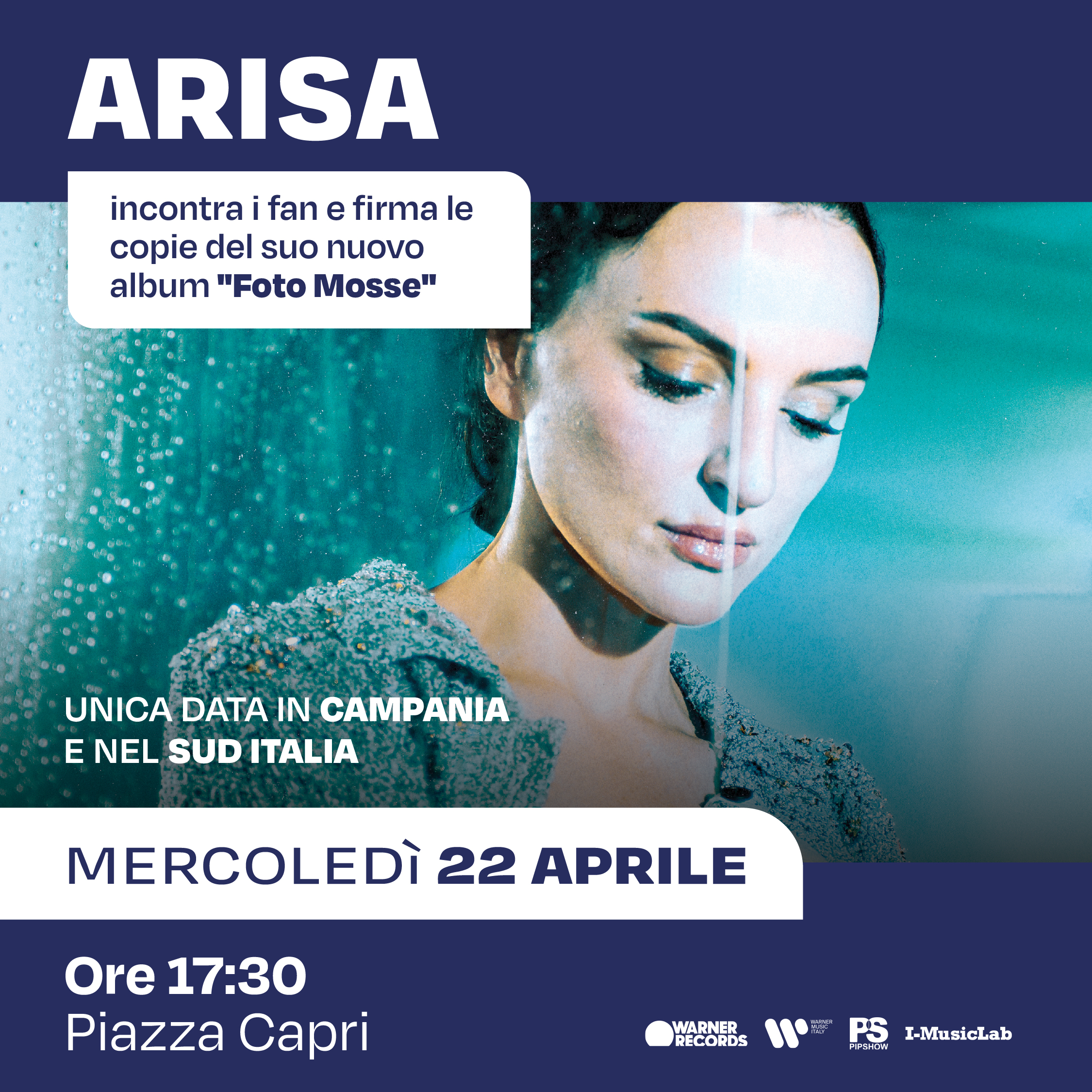 Mercoledì 22 aprile, alle ore 17:30 in Piazza Capri, Arisa, voce intensa e autentica del panorama musicale italiano, incontra i fan per firmare le copie del suo nuovo album “FOTO MOSSE”.