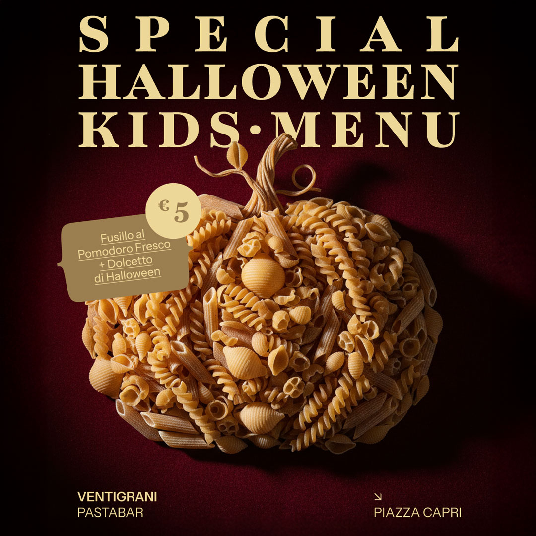 Questo Halloween porta i tuoi piccoli mostriciattoli al Pastabar Ventigrani e scopri il nostro Special Kids Menu a 5€: Fusilli al pomodoro fresco + dolcetto di Halloween.